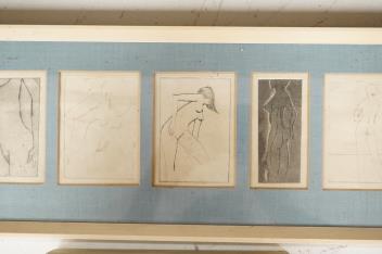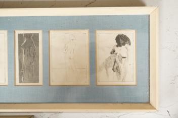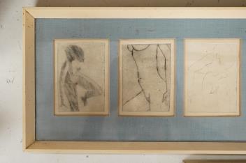 Lot 1720 , Bill Parrot, Set of seven etchings, Nude female studies, unsigned, framed as one, inscribed verso together with a small oil study of a locomotive, largest overall 16.5 x 56cm