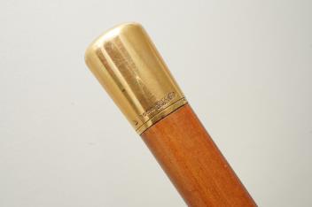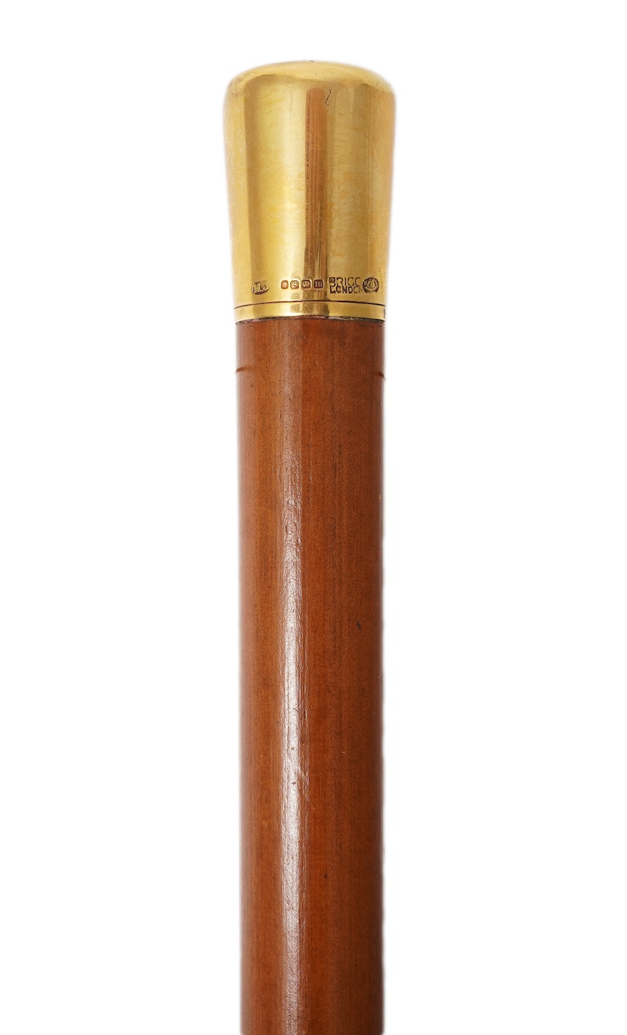Brigg, a gold-mounted walking cane, circa 1913, the wooden cane capped in 18ct gold, British hallmarks, signed Brigg London, maker's mark MJ and BS with ship, length 94cm