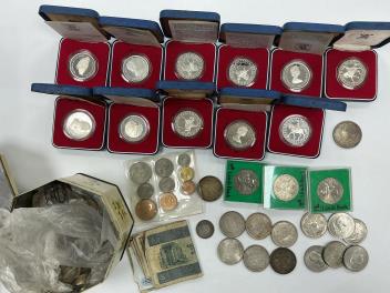 British and Commonwealth coins, the majority Elizabeth II, including eleven proof silver coins commemorating the Queen’s silver Jubilee, 1977, in cases, some with certificates, damp damaged, seven George VI, New Zealand crowns, 1949, other various crowns, 1953 brilliant UNC coin set and various world coins including France silver Fr.50 1975 and various used bank notes