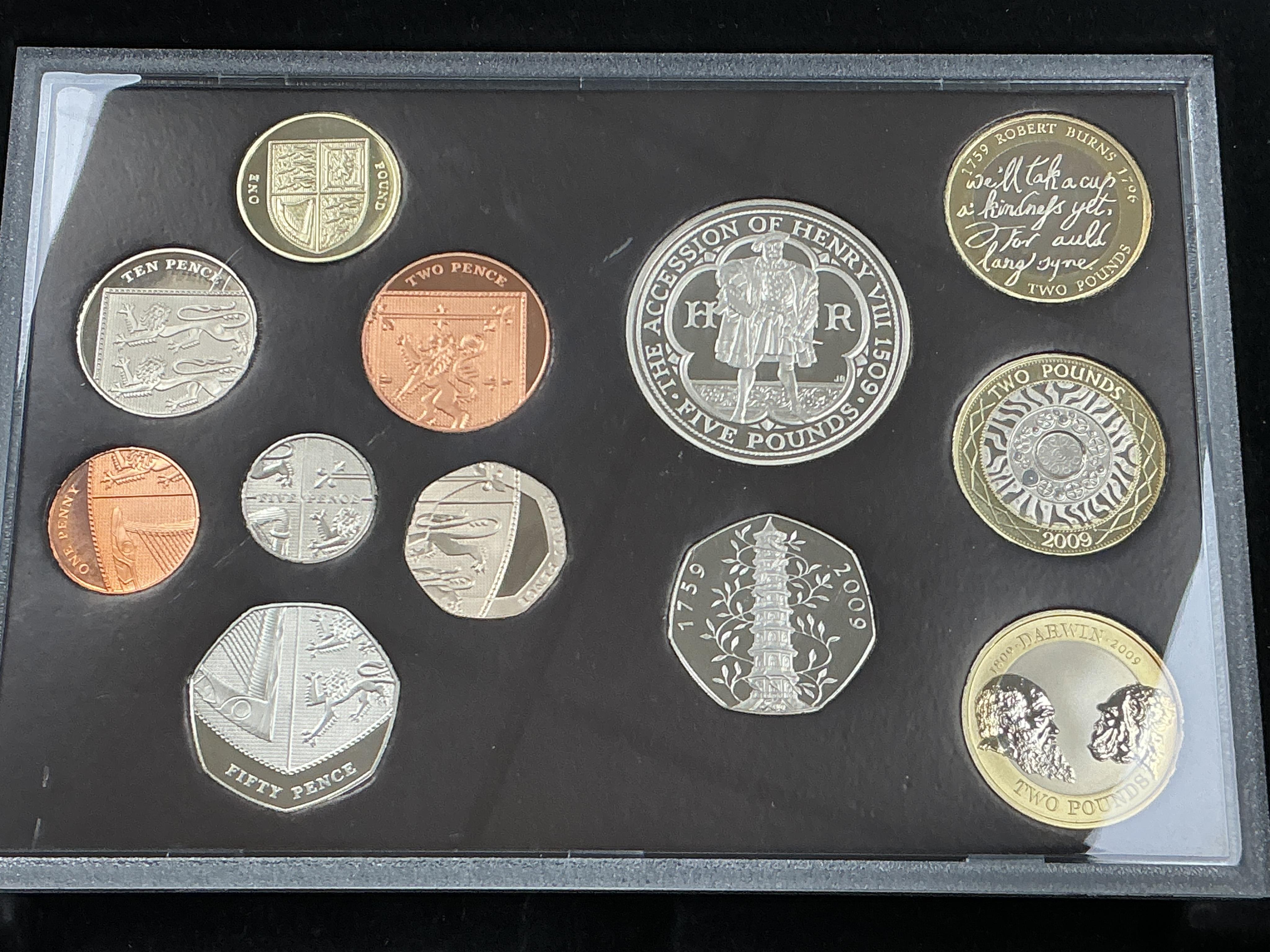 Lot 2090 , British coins, Elizabeth II, Royal Mint proof coin set, 2009, including the scarce Kew Gardens 50p, cased, in blue cardboard box