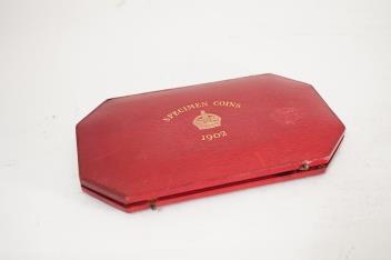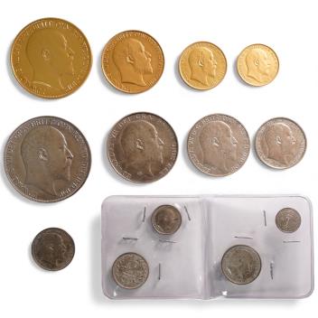 Lot 2110 , British gold coin set, Edward VII, 1902 matte proof thirteen coin set, comprising gold five pounds, two pounds, sovereign and half sovereign, virtually as struck, silver crown, halfcrown, florin, shilling, sixpence and m