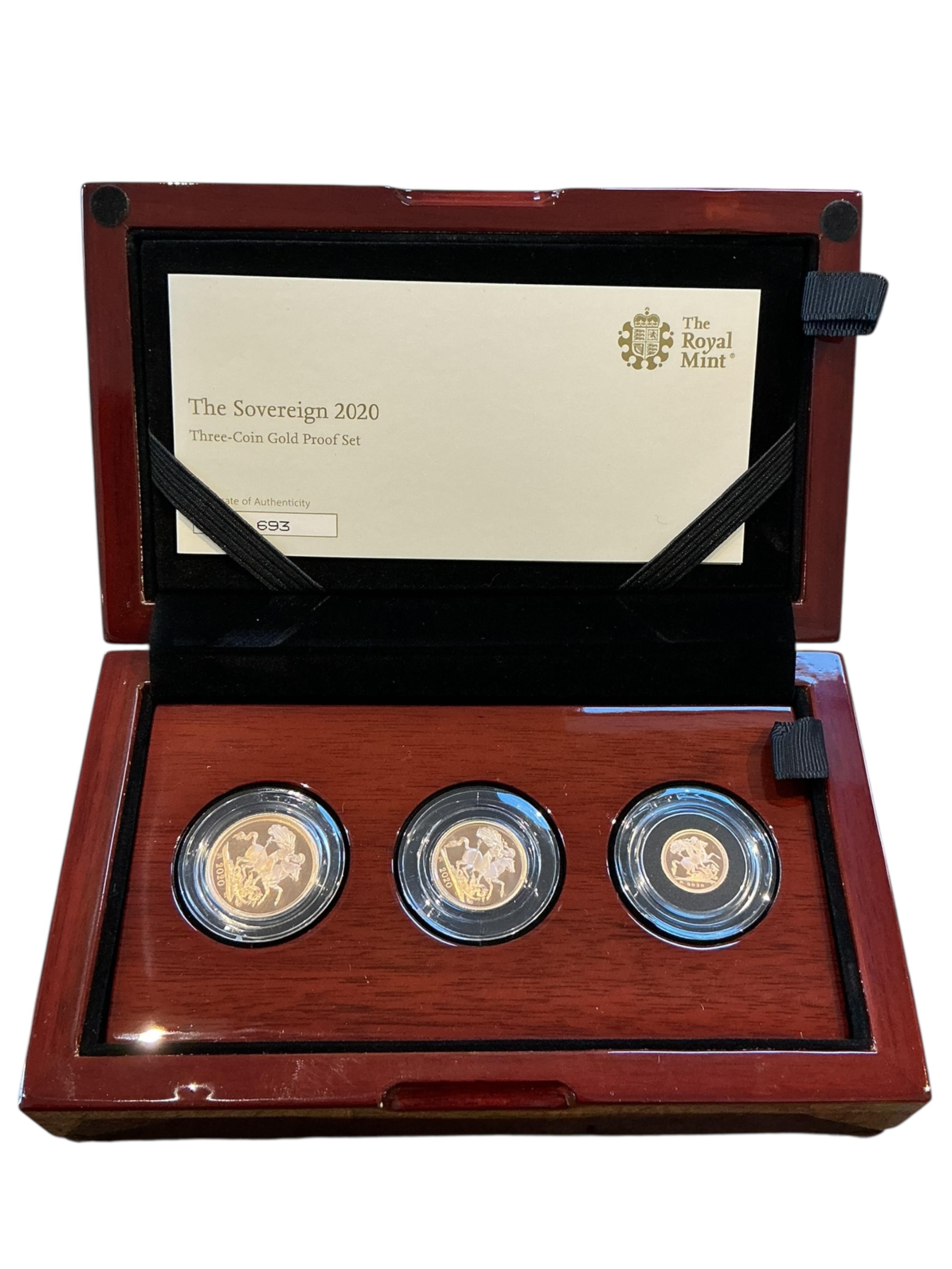 Lot 2119 , British gold coins, Elizabeth II, Royal Mint gold proof three coin set, 2020, comprising £2, sovereign and half sovereign, in case of issue with certificate