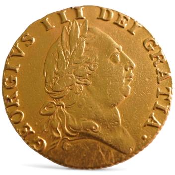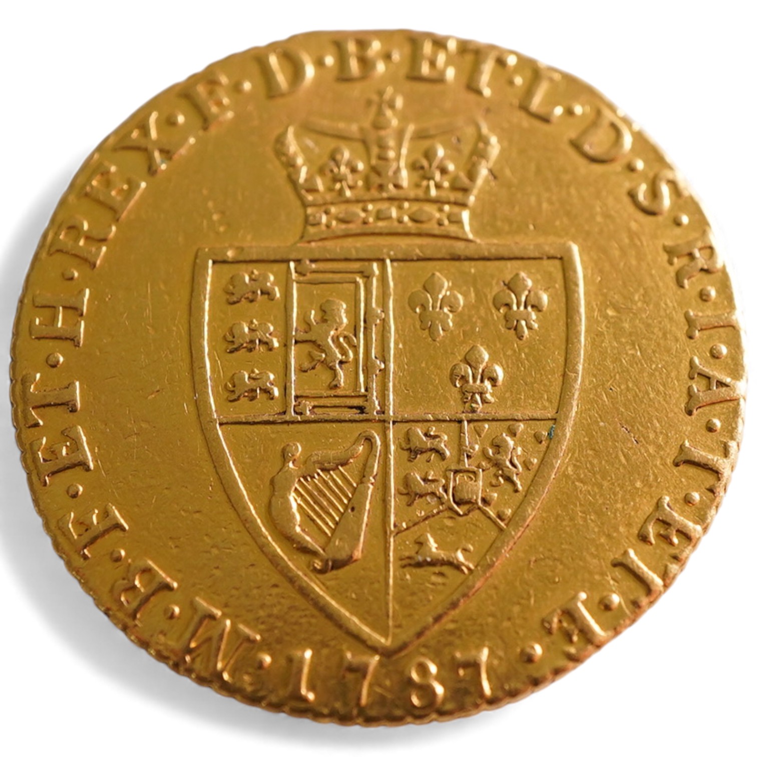 British gold coins, George III, gold guinea, 1787, S. 3729, demounted at 12 o’clock, otherwise about VF