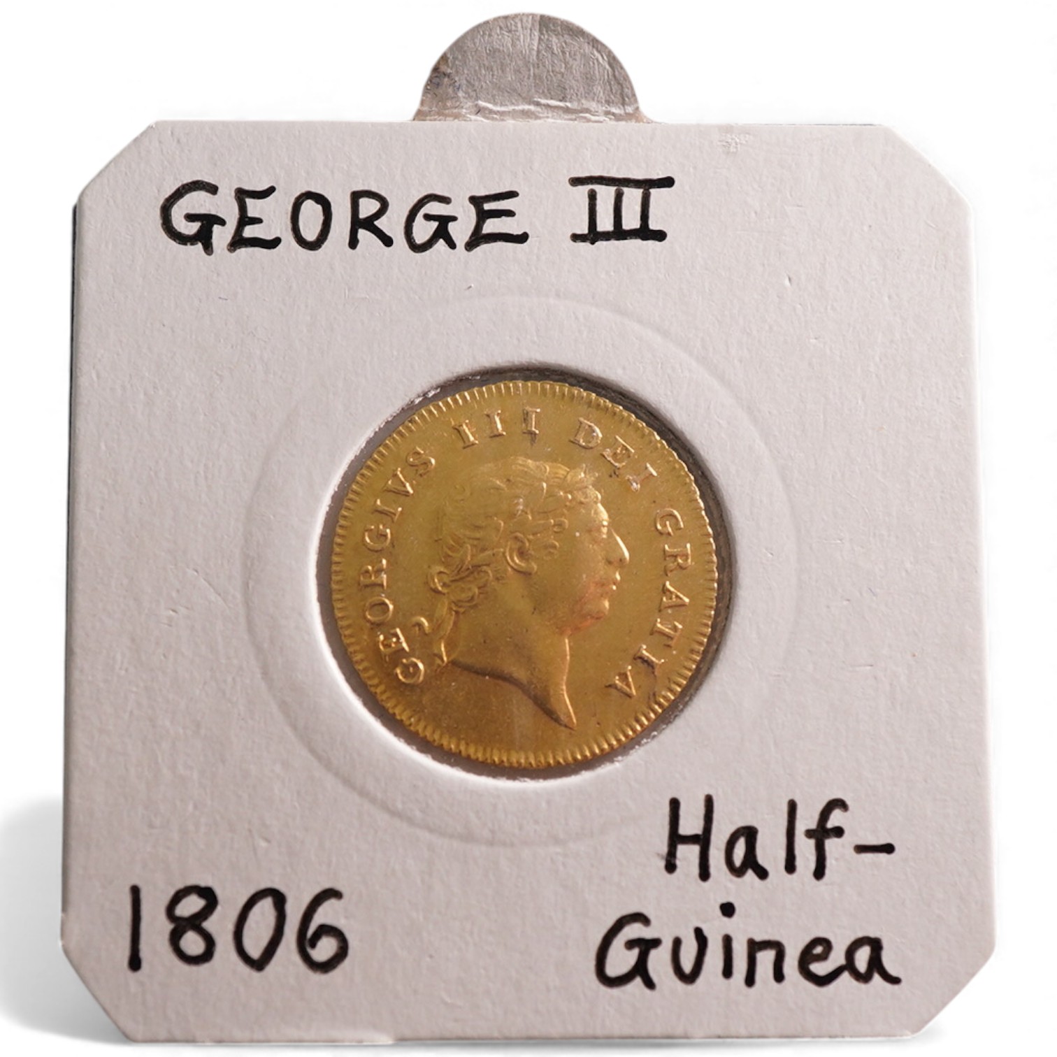 Lot 2105 , British gold coins, George III, gold half guinea, 1806, seventh bust, S 3737, VF or better