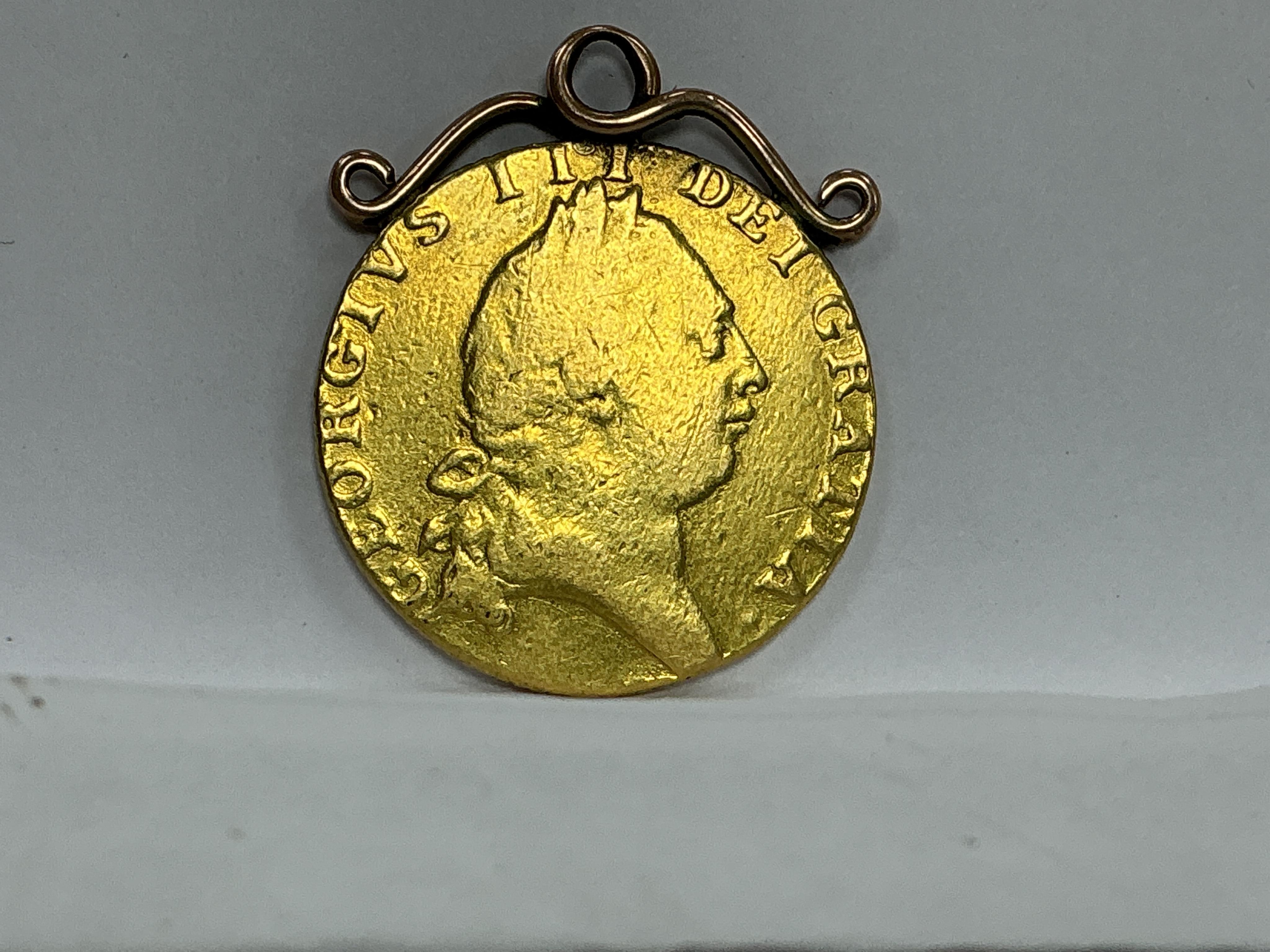 British gold coins, George III, spade guinea, 1790, mounted, about fine, gross weight approximately 8.78 g