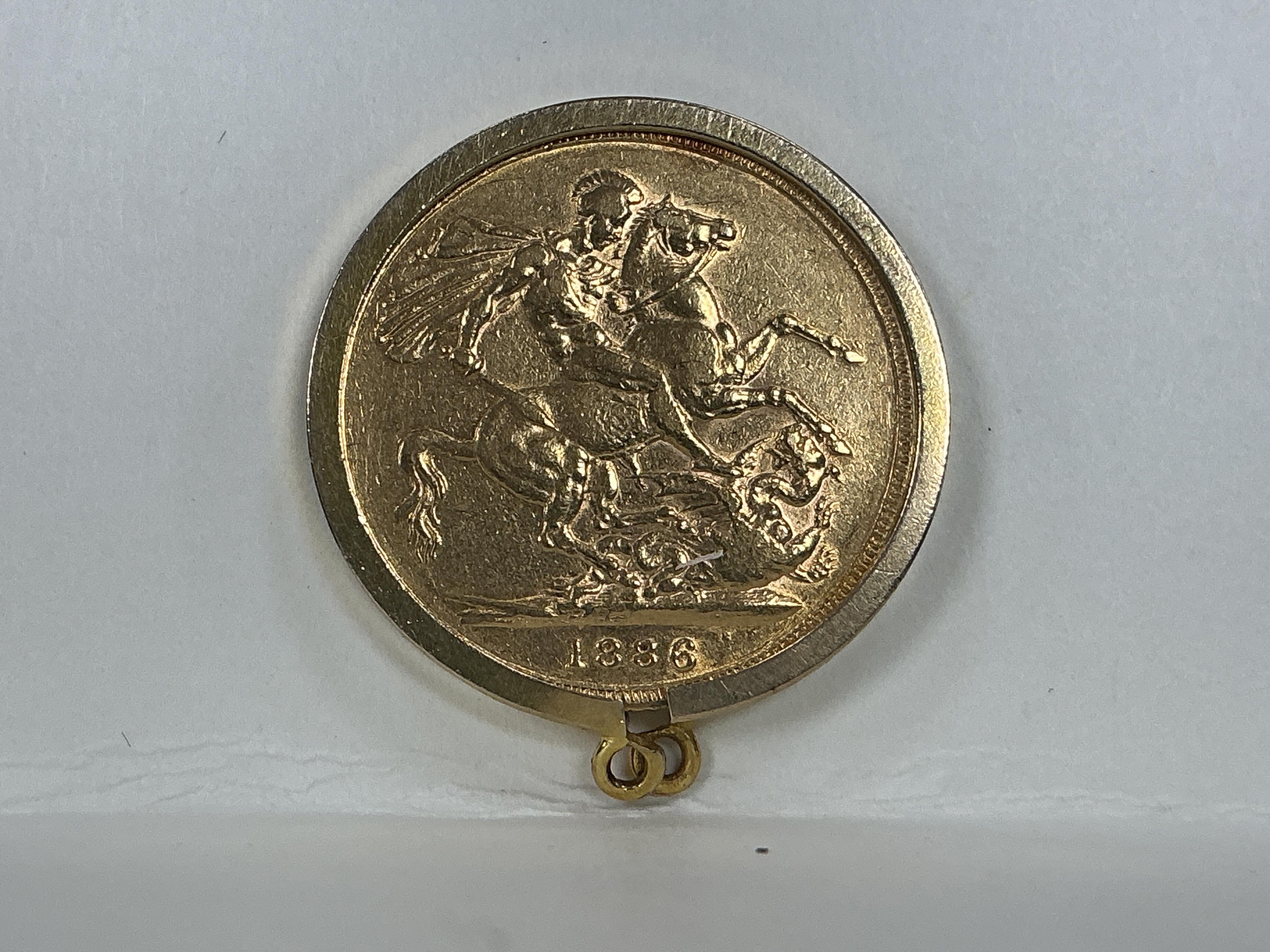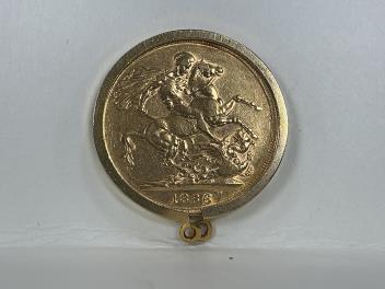 Lot 2097 , British gold coins, Victoria, gold sovereign, 1886 S (Sydney), fine or better, unusually large 6 in date however the weight, diameter and thickness are correct, in a later 9ct. gold mount