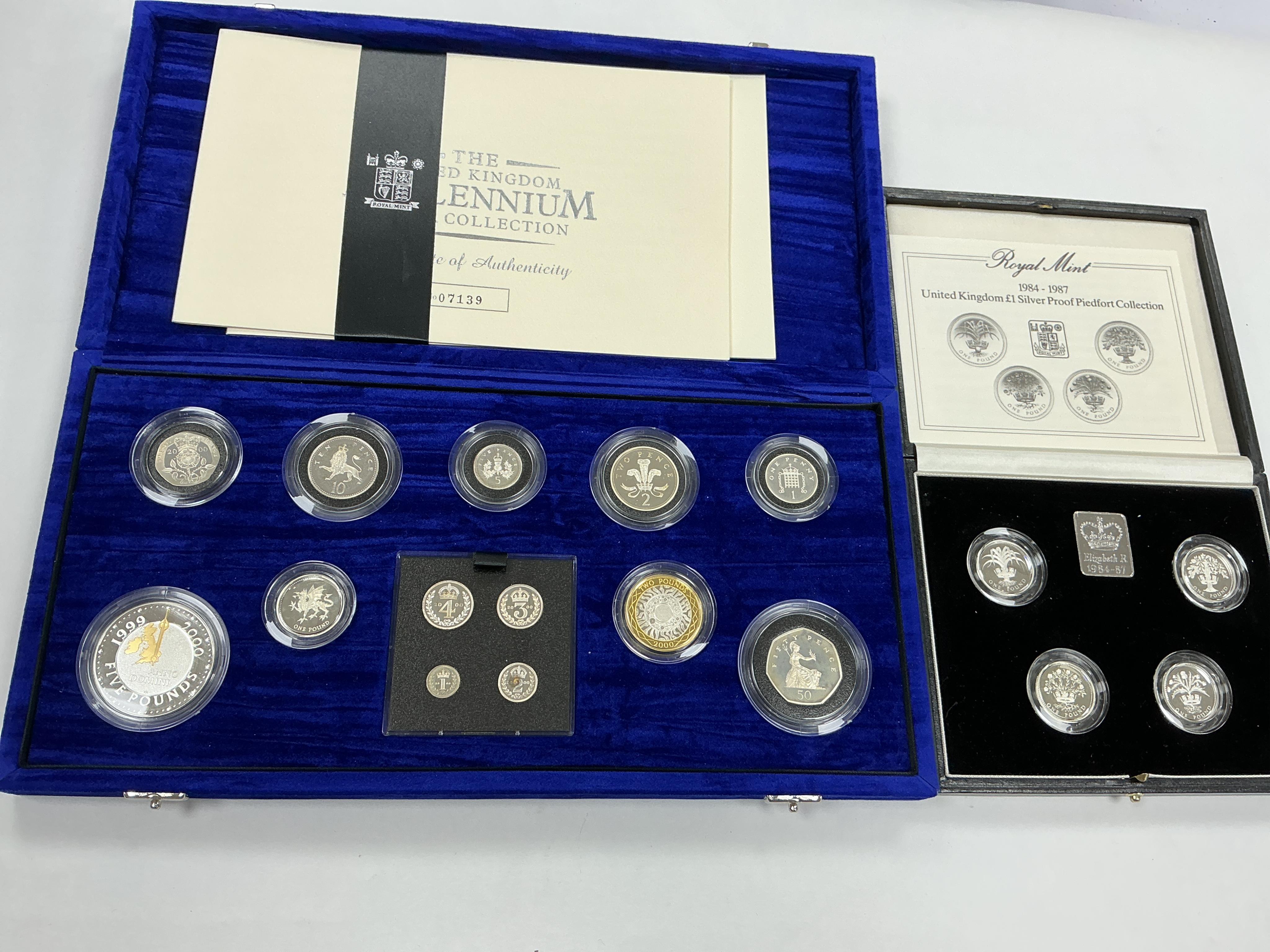 Lot 2078 , British proof silver coins, Elizabeth II, UK millennium silver collection, 2000, including maundy 1p - 4p, and, UK £1 silver proof £1 silver proof piedfort collection 1984–1987, each in case of issue with certificate
