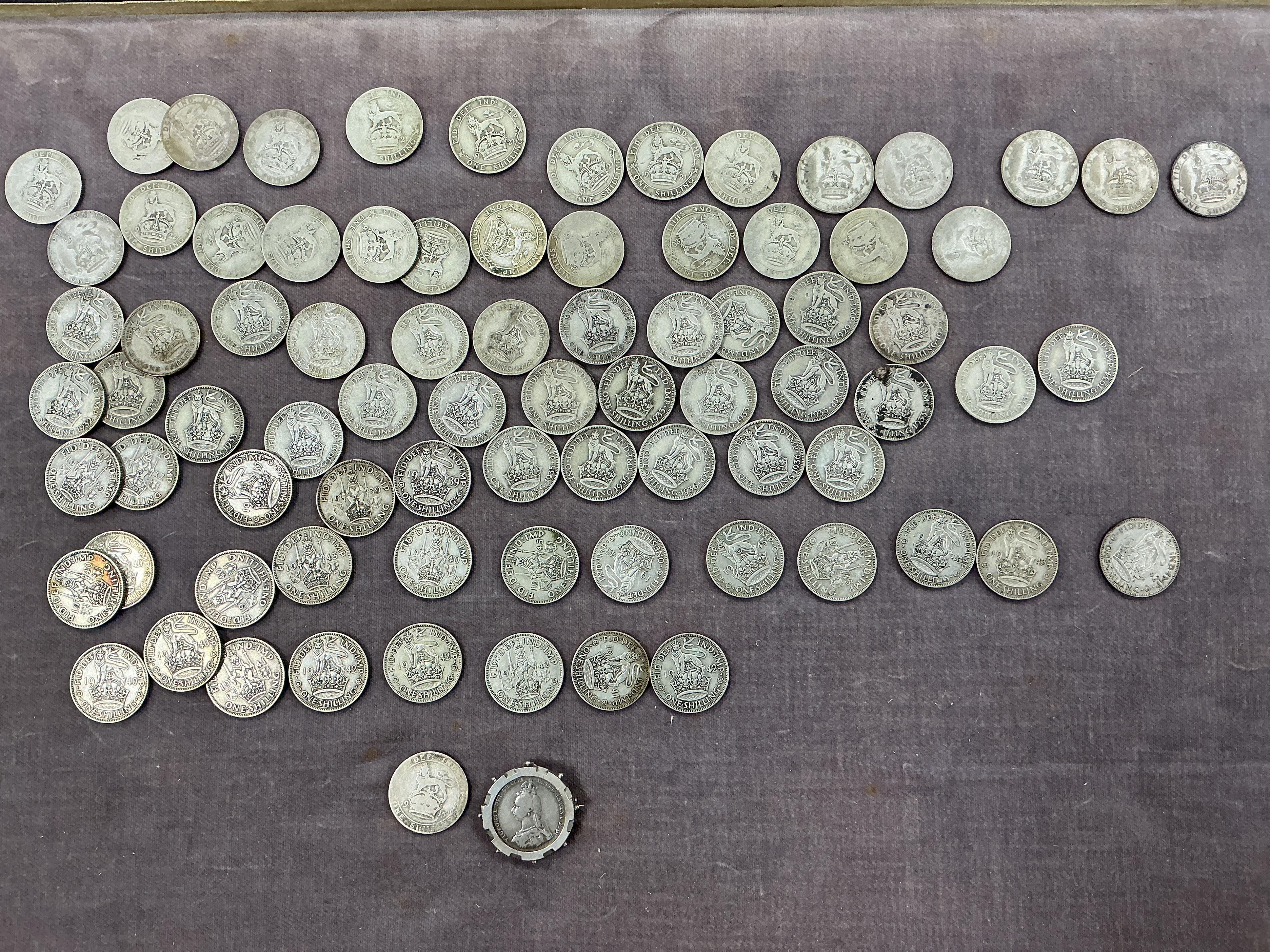 Lot 2054 , British silver coins, Victoria to George VI, Victoria, shilling 1888, mounted as a brooch, 1915 shilling and 80 shillings, 1920-46