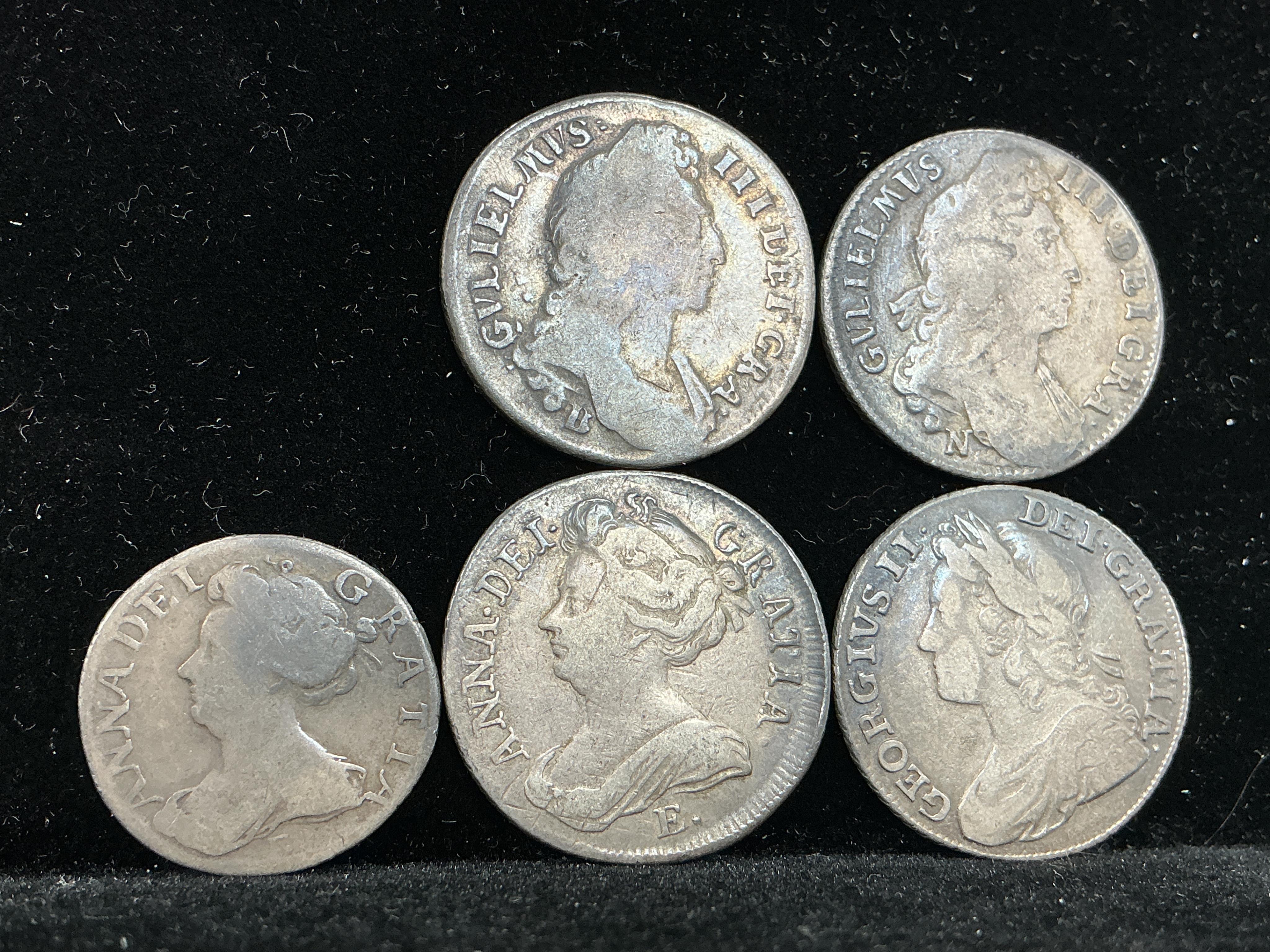 Lot 2077 , British silver coins, two William III shillings, 1696B (Bristol), 1697N (Norwich), Anne 1709E (Edinburgh), fine, sixpence 1707, and George II shilling, 1739, S. 3701 (5)