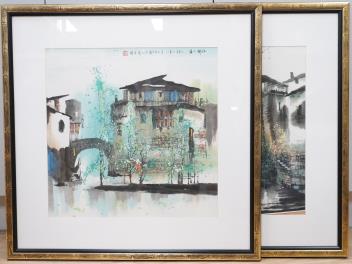 Cao Ren-Rong (Chinese, b.1943), Studies of houses and foliage, each signed with character marks and red seal mark, exhibition leaflet details verso, pair of watercolours, 50 x 50cm