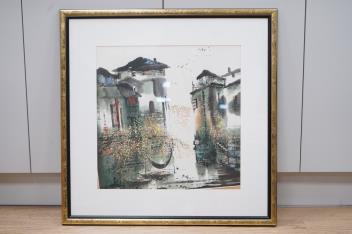 Lot 1731 , Cao Ren-Rong (Chinese, b.1943), Studies of houses and foliage, each signed with character marks and red seal mark, exhibition leaflet details verso, pair of watercolours, 50 x 50cm