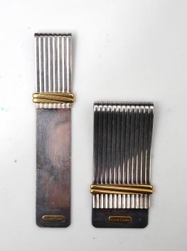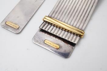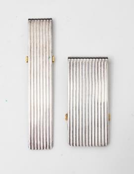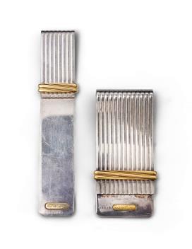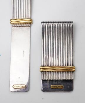 Cartier, two 'Must de Cartier' money clips, each of fluted form in stainless steel with gilt details, length 8cm and 5.4cm respectively, each signed Must de Cartier Made in France, numbered 009717 and 000673, each with French maker's marks, case stamped Must de Cartier