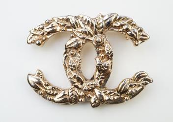 Chanel, a 'Coco Mark' brooch, designed as the crossed 'C' monogram for Coco Chanel, with foliate details, mounted in gilt metal, length 4cm, signed Chanel, stamped Made in Italy, numbered 14A