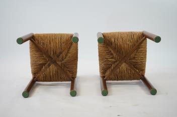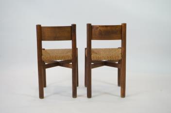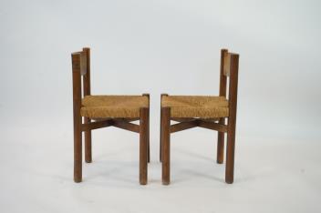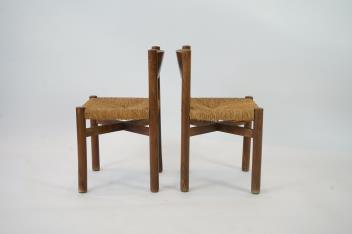 Charlotte Perriand (French, 1903-1999) A pair of 'No. 27' or 'Meribel' side chairs, the stained wood frames possibly in sipo, with turned cylindrical legs and curved backrest above a rush seat and flat-section crosspiece, each 75cm high x 42cm wide (2)