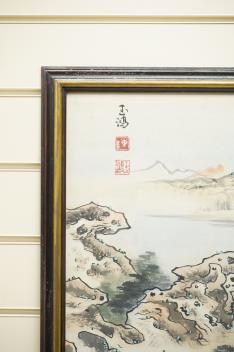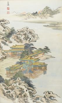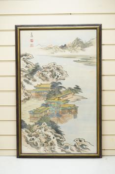 Lot 1716 , Chinese School, 20th century, Riverscape with pagodas, signed with character marks and red seal marks, ink and watercolour, 81 x 49cm