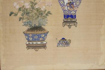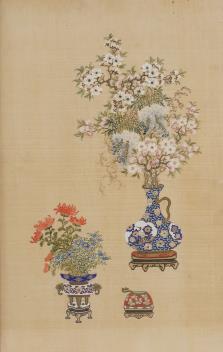 Lot 246 , Chinese School , (Early 20th century), Antique vessels and flowers, Ink and colour on silk, 57cm x 36cm