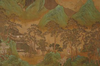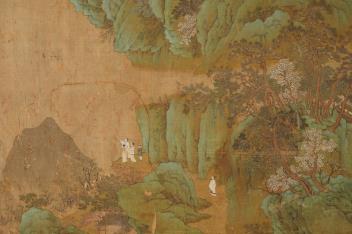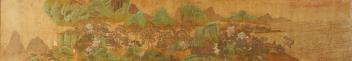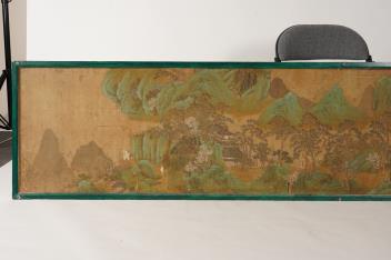 Lot 249 , Chinese School , 17th century or earlier, Scholars in a mountainous river landscape scene with pavilions, Ink and colour on silk, incomplete clerical script signature, 54cm x 290cm