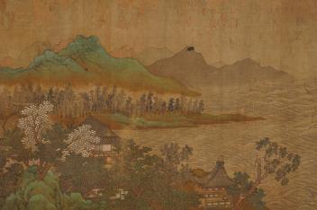 The painting has a number of holes and losses to the silk particularly in the sky and to each end with a silk lining below, some staining and scuffing all over, later stuck down to a board. Some slight chips to the edges of the board and therefore slight damage to the silk.