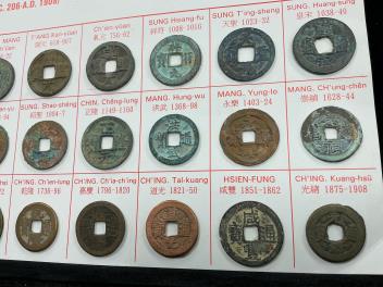 Lot 2049 , Chinese cash coins, Han to Qing dynasty, 206BC to AD 1908, stuck to card, including -, Ban Liang (206BC - 6AD) and Wu Zhu (6 - 221AD), Han dynasty, Wang Mang huoquan (6 - 22AD), Xin dynasty, Kianyuan tongbao (618-907) an