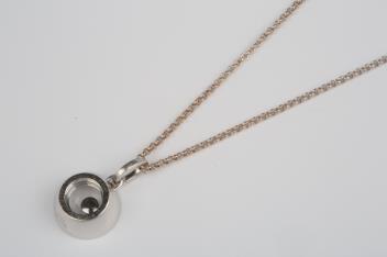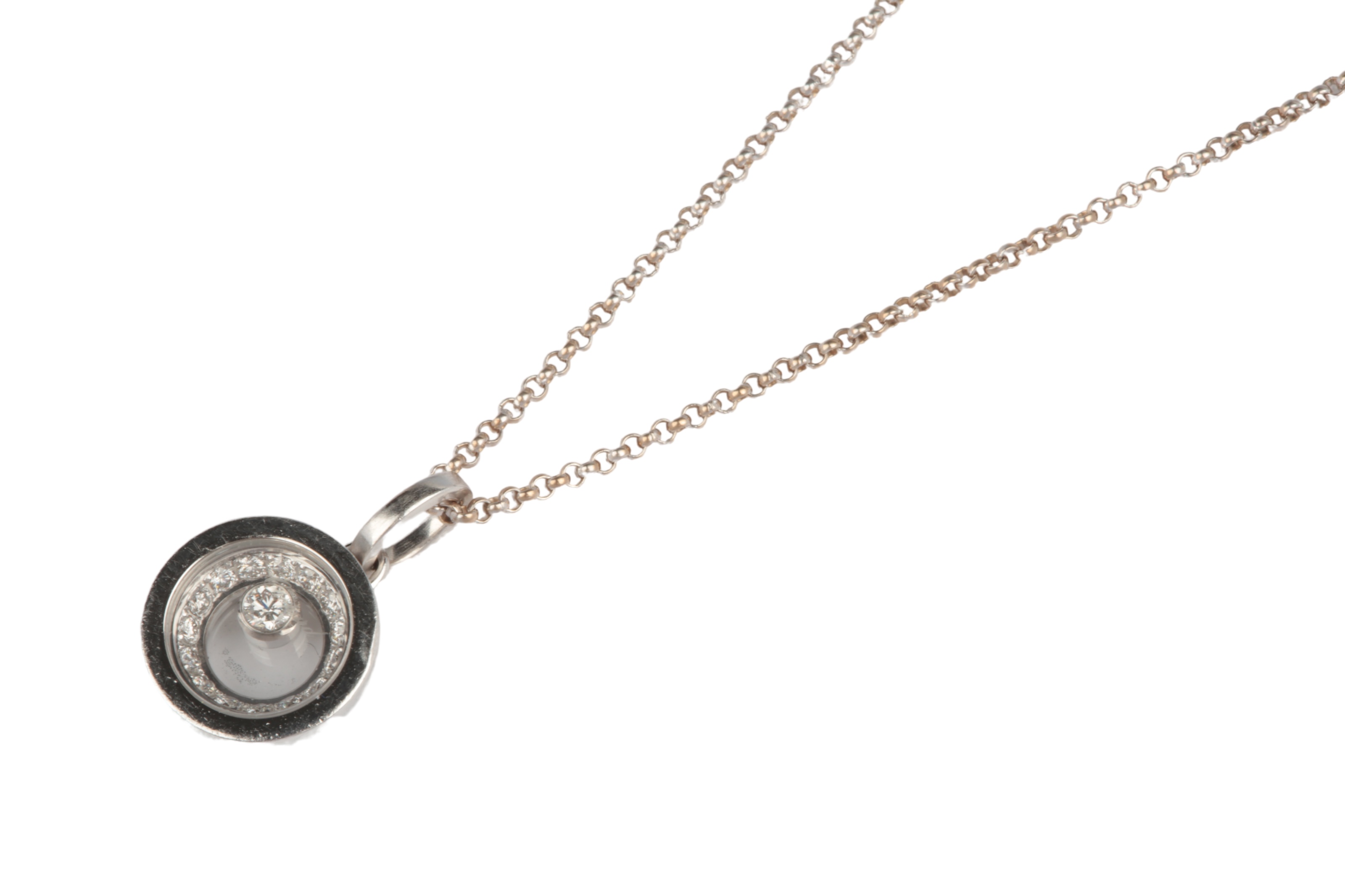 Chopard, a 'Happy Diamonds' pendant, the circular pendant designed as a glazed compartment, containing a freely moving collet-set brilliant-cut diamond weighing approximately 0.10 carats, the interior lined with pavé-set brilliant-cut diamonds, to a chain necklace, pendant length 2cm, signed Chopard, stamped 750, numbered 797789-1001 and 6225239, chain signed Chopard, stamped 750, gross weight approximately 11 grams