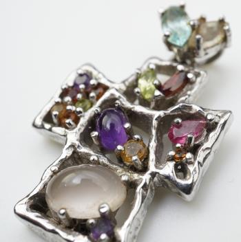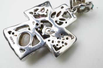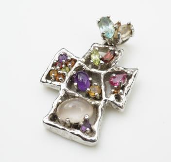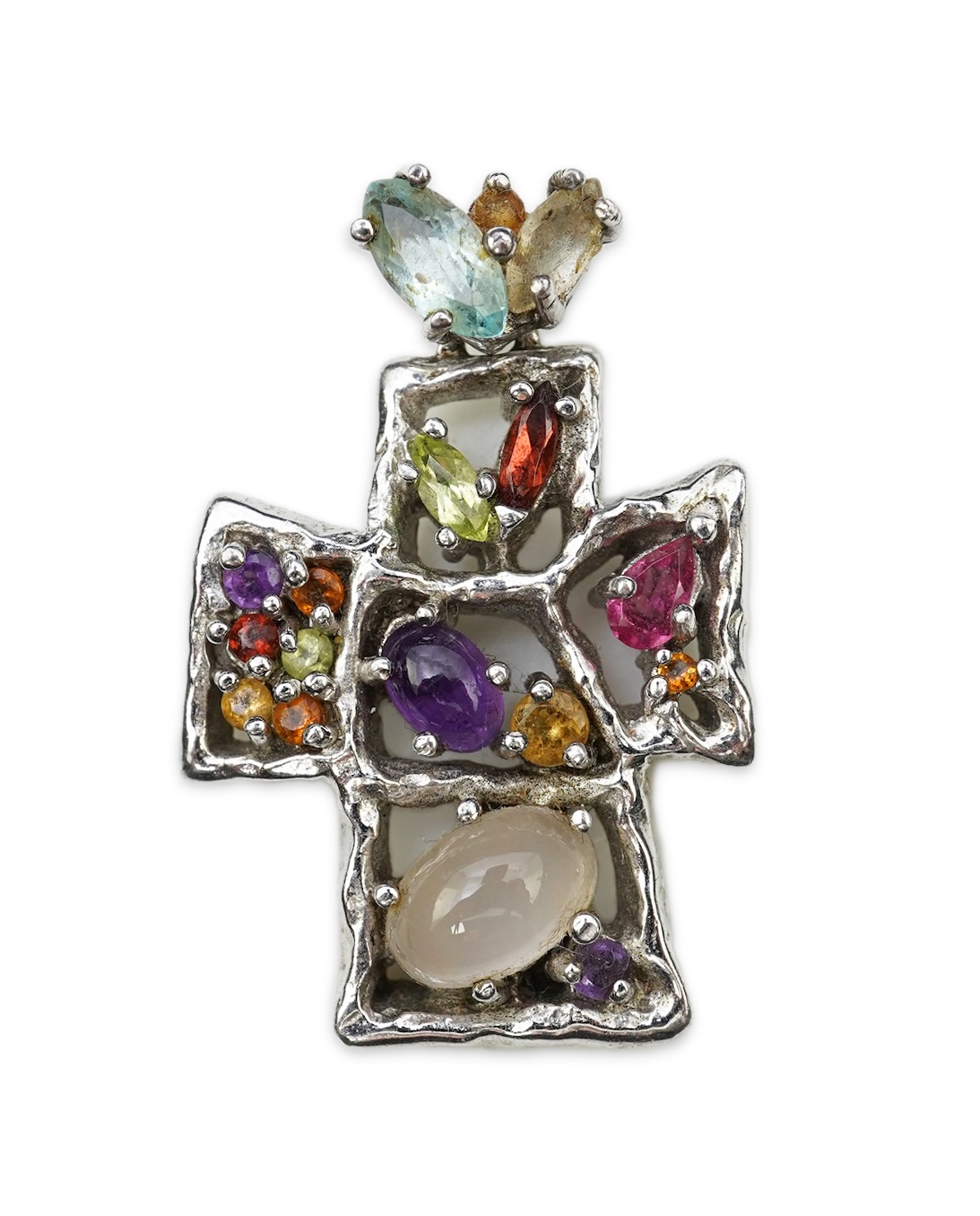 Christian LaCroix, a gem-set pendant, designed as a cross in textured silver, set with variously cut gemstones including chalcedony, amethyst, blue topaz and citrine, length 3.5cm, British hallmarks, maker's mark for Christian LaCroix