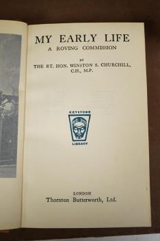 ° Churchill, Sir Winston Leonard - 6 vols., uniformly bound half calf and cloth, gilt decorated panelled spines with red and green labels, gilt tops and marbled e/ps. (by Sotheran's); comprising: My Early Life: a roving commission. Keystone Library Edition. folded map, 16 plates and text illus. 2nd impression, 1937; Thoughts and Adventures. frontis. and text illus. 4th impression, 1932; bound with - Painting as a Pastime. 18 coloured plates. 2nd impression, 1949; Step by Step, 1936-1939. folded map with outline colour and a text map. 4th impression, 1940; Into Battle: speeches by ... (1938-1940). 11th edition. port. frontis. 1945; bound with - The Unrelenting Struggle: war speeches ... 4th editiion. portrait and 2 plates. 1946; The End of the Beginning: war speeches ... (1942). 3rd edition. 5 plates. 1946; bound with - Onwards to Victory: war speeches ... (1943). 2nd edition. 5 plates. 1945: The Dawn of Liberation: war speeches ... (1944). 2nd edition. 5 plates. 1947; bound with Victory: war speeches ... (1945). 1st editiion. 5 plates. 1946; bound with - Secret Session Speeches ... 1st edition. 16 plates. 1946
