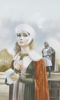 Contemporary School, Medieval maiden before a knight, unsigned, gouache, 46 x 27cm