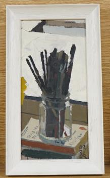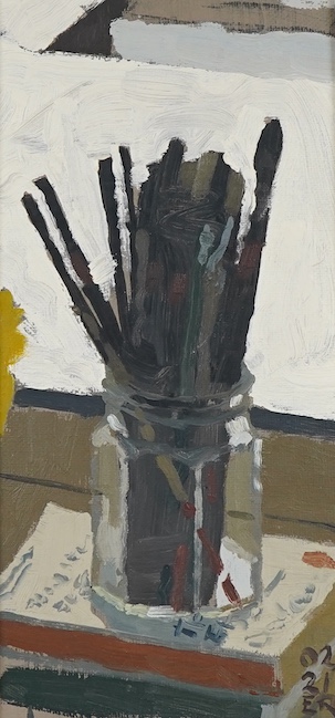 Lot 716 , Contemporary school, E.R monogrammist, still life of artists brushes, oil on board, 24 x 11cm