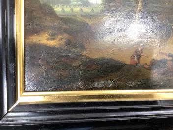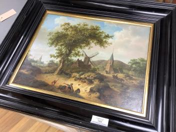 Lot 783 , Continental School, 19th century, Landscape with figures before a windmill, oil on panel, housed in a moulded ebonised frame, 28 x 37cm