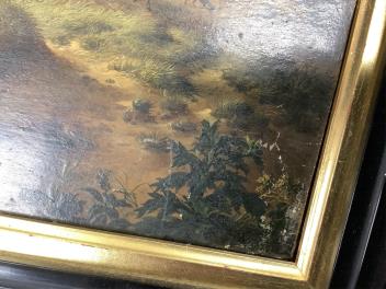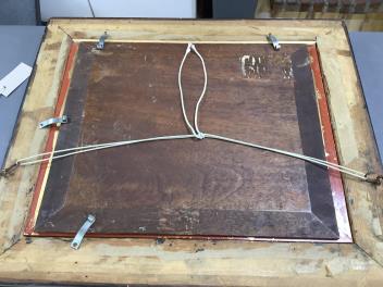 Bottom corners with light scratches, as shown; upper-left corner similar; panel poorly attached to frame; rubs around edges of panel caused by movement in the frame. Frame with minor rubs.