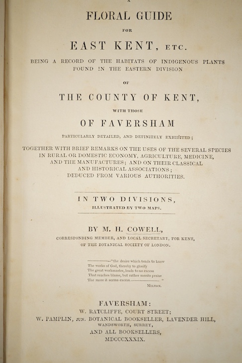 Lot 1110 , Cowell, M.H. - A Floral Guide for East Kent, Etc... with those of Faversham particularly detailed ... 2 maps (1 d-page and coloured); sometime rebound calf backed marbled boards with red label. Faversham and London, 1839