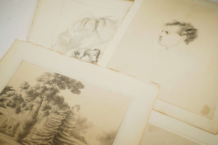 Cramer, Johann Baptist (1771-1858). Allegretto scherzando. Autograph music manuscript signed and dated 1832, one leaf, loosely laid down, together with one other music manuscript (4pp.) on embossed paper by Neukomm, (Sigismund). Song in Shakespeare's Twelth Night. Also five early 19th century pencil studies (disbound with frayed edges) and a handwritten and illustrated poem. (8).