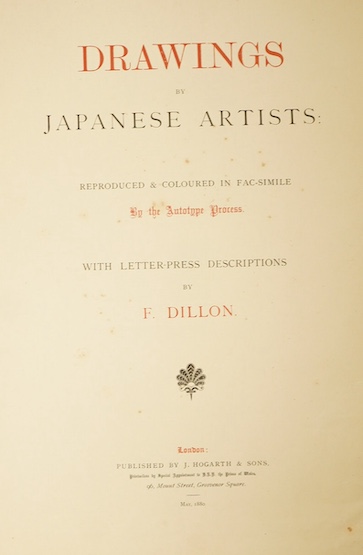 ° Dillon, F Drawings by Japanese Artists. Reproduced and Coloured in fac-simile by the Autotype Proces. With Letter Press Descriptions. illus. 9 (of 15) colour plates. title+16pp. + 9 (of 15) descriptive text leaves. Original decorative cloth portfolio boards with gilt lettering and floral motifs. 1880