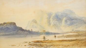 Lot 763 , Edwin Earp (1851-1945), Mountainous riverscape with angler, signed, watercolour heightened with white, 23 x 38cm