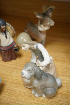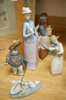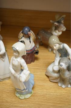 Eight Lladro porcelain figures, and one similar Tengra figure, girl carrying basket, tallest Lladro 32cm