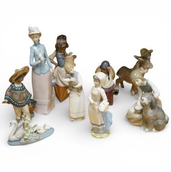 Lot 333 , Eight Lladro porcelain figures, and one similar Tengra figure, girl carrying basket, tallest Lladro 32cm