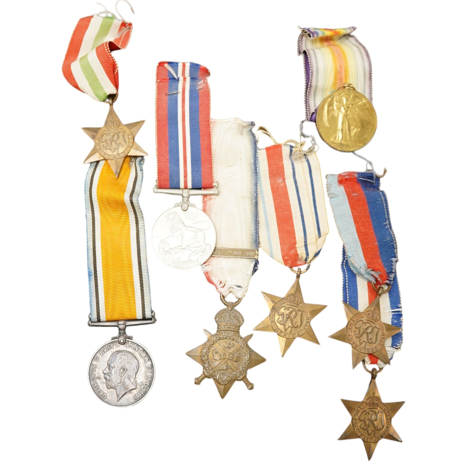 Eight military medals, understood to comprise of father and son groups; a First World War medal trio awarded to L-10098 Pte. F.G. Searle. Royal Sussex Reg., including a Mons Star with clasp for 5th Aug - 22nd Nov 1914, and five WWII medals including; The Italy star, The Africa star, The France and Germany star, The 1939-1945 star, and the 1939-1945 medal