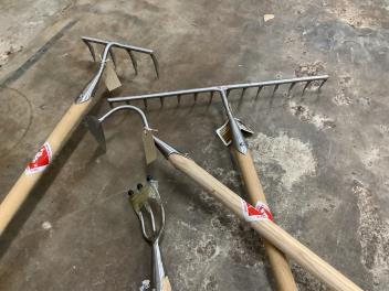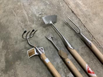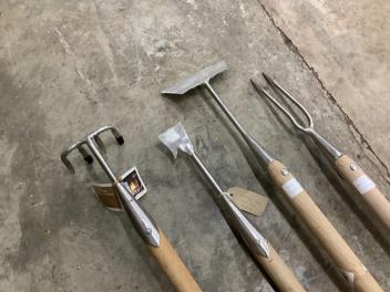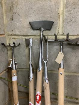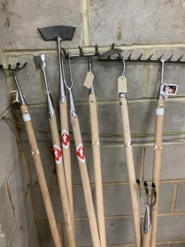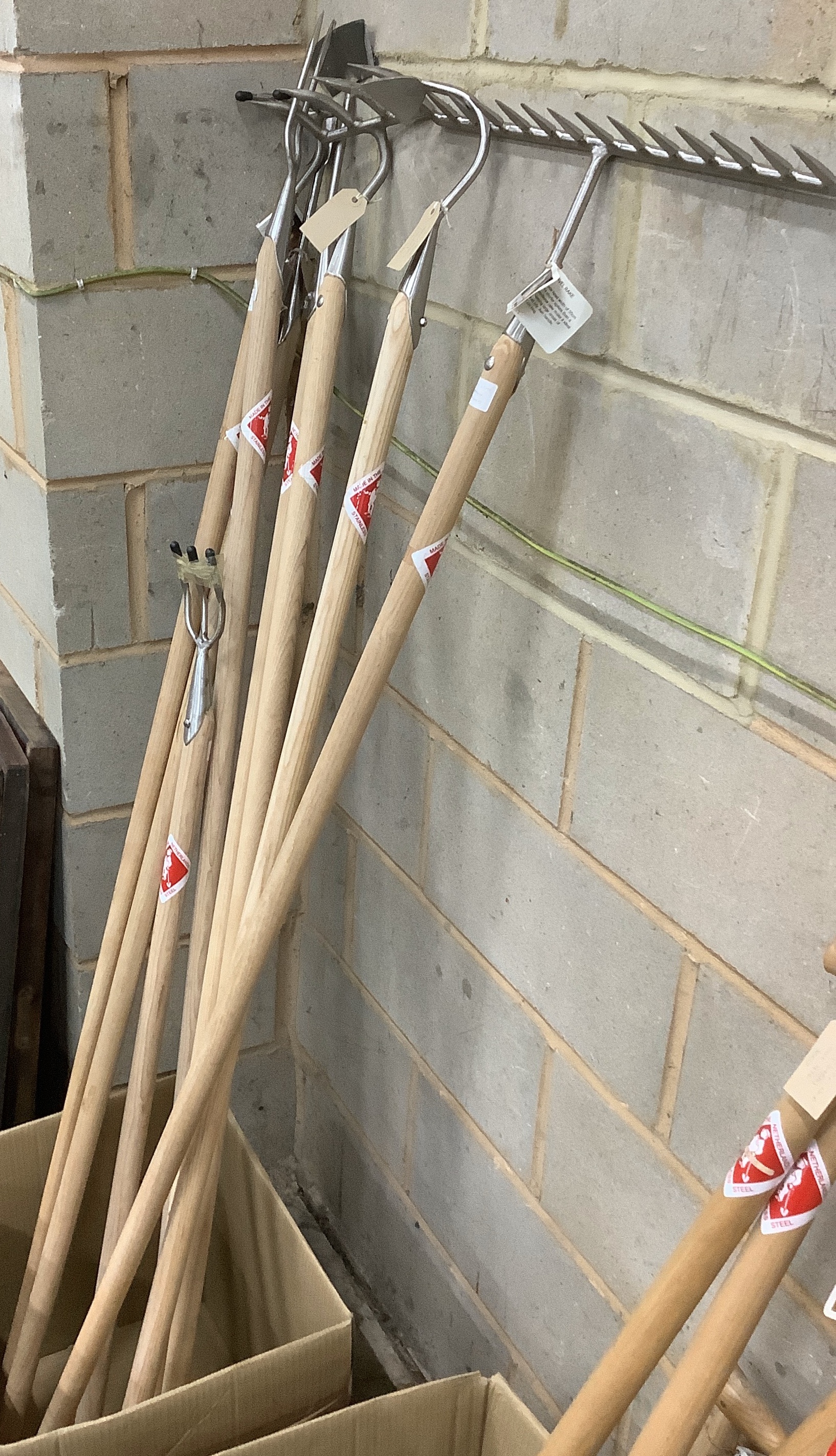 Eight unused Sneeboer, The Netherlands, garden tools, including; a gravel rake, a half moon pull hoe, a ditch rake, a push hoe, a two prong long handed weeder, a border hoe, a narrow head rake, and a long handled hand fork