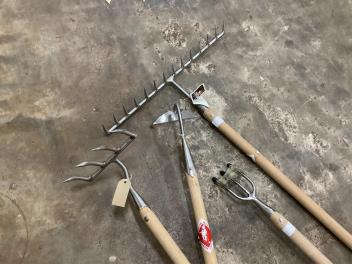 Lot 1078 , Eight unused Sneeboer, The Netherlands, garden tools, including; a gravel rake, a half moon pull hoe, a ditch rake, a push hoe, a two prong long handed weeder, a border hoe, a narrow head rake, and a long handled hand fo