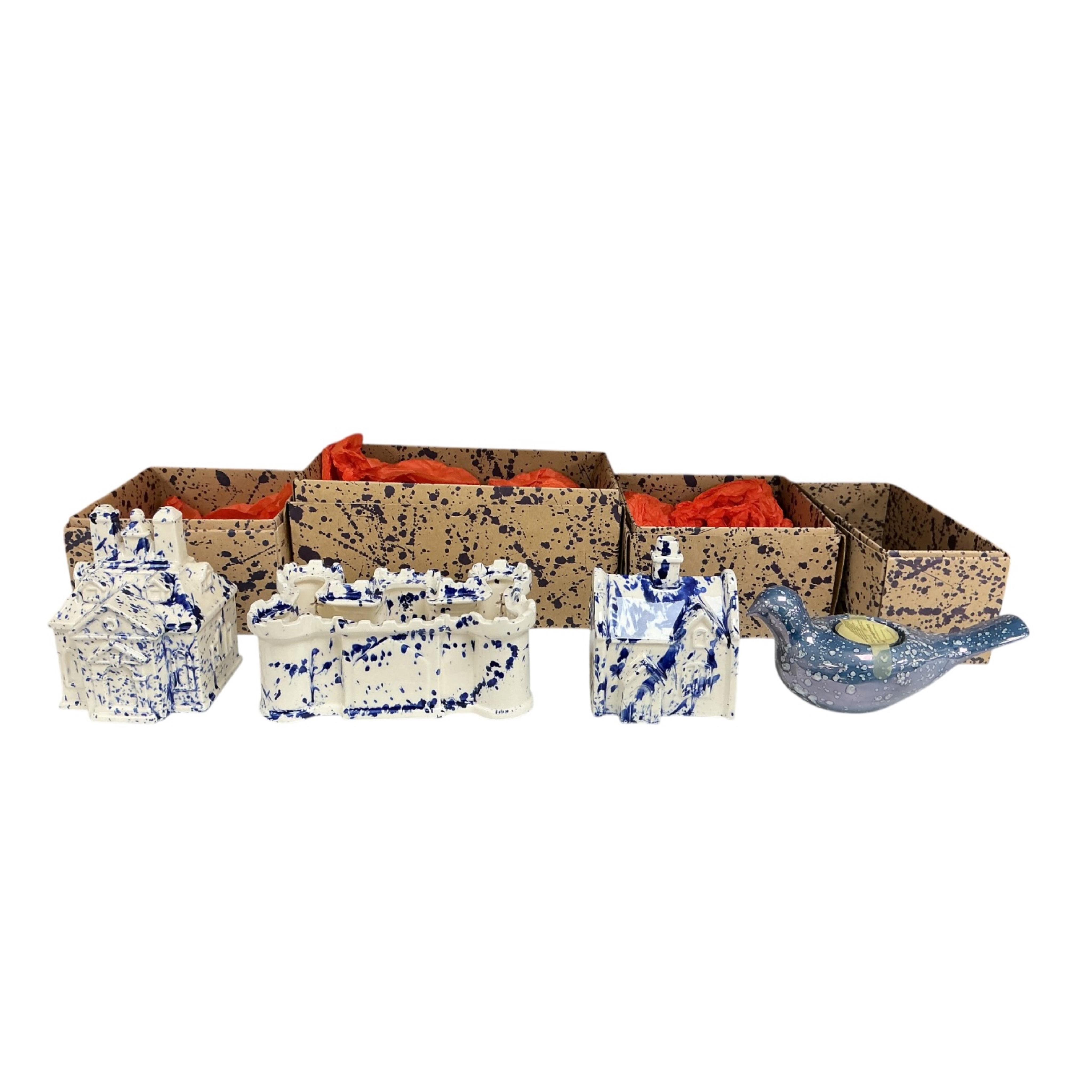 Lot 1251 , Emma Bridgewater. A collection of blue splatter pottery with a bird candlestick all boxed, (4).largest castle - 18cm wide
