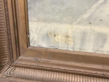 Canvas dirty with a series of white spots clearly visible against the dark ground; hand-written label verso; signed lower-right and, less clearly, lower-left. Frame with a series of missing sections.