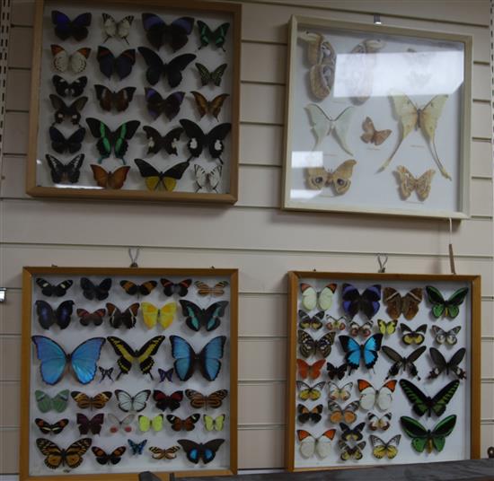 Entomological Interest: Four framed and mounted displays of butterflies and moths, collected from the 1980's onwards, with specimens from South America, Africa and Asia, each frame square, one mounted with exotic moth specimens, 46cm sq.