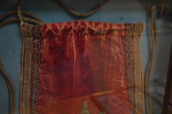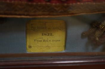 Lot 306 , Eton interest - a commemorative William IV, ceremonial red velvet, gold metallic thread, tasselled and braided bag, mounted within a mahogany glazed cabinet. An old printed ticket in Latin mounted beneath: Pro More et Mo
