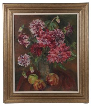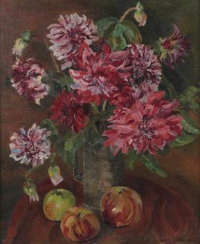 Lot 15 , Eveline May (Eve) Quinlan, (1880-1955), Still life study of red dahlias and apples