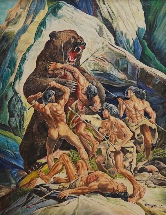 Lot 743 , F. Guilliek (?), Illustration, bear fighting scene, signed and dated 1964, oil on canvas, 89 x 64cm