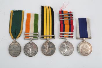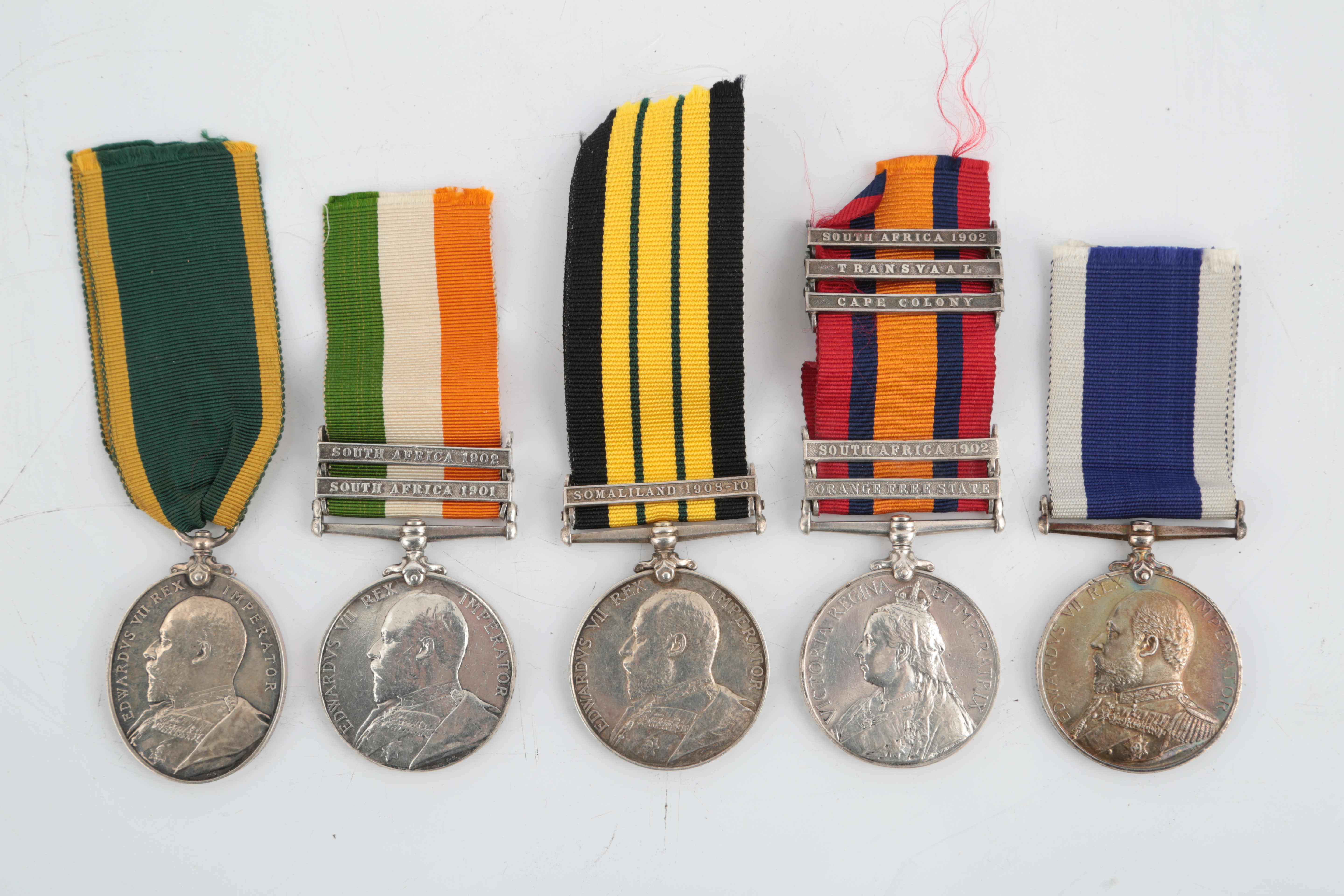 Five Victoria and Edward VII medals; a South Africa medal pair awarded to 83840. GNR. J. Lindsay. R.F.A.; comprising of a Queen’s South Africa medal with clasps for Orange Free State, South Africa 1902, Cape Colony, and Transvaal, and a King’s South Africa medal with clasps for South Africa 1901 and South Africa 1902, (both renamed)