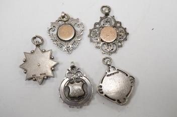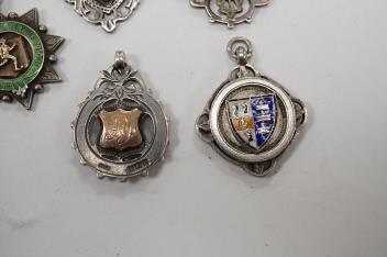 Five assorted early 20th century silver medals, including enamelled 'Luton District Football League, 1910/11', diameter 28mm.