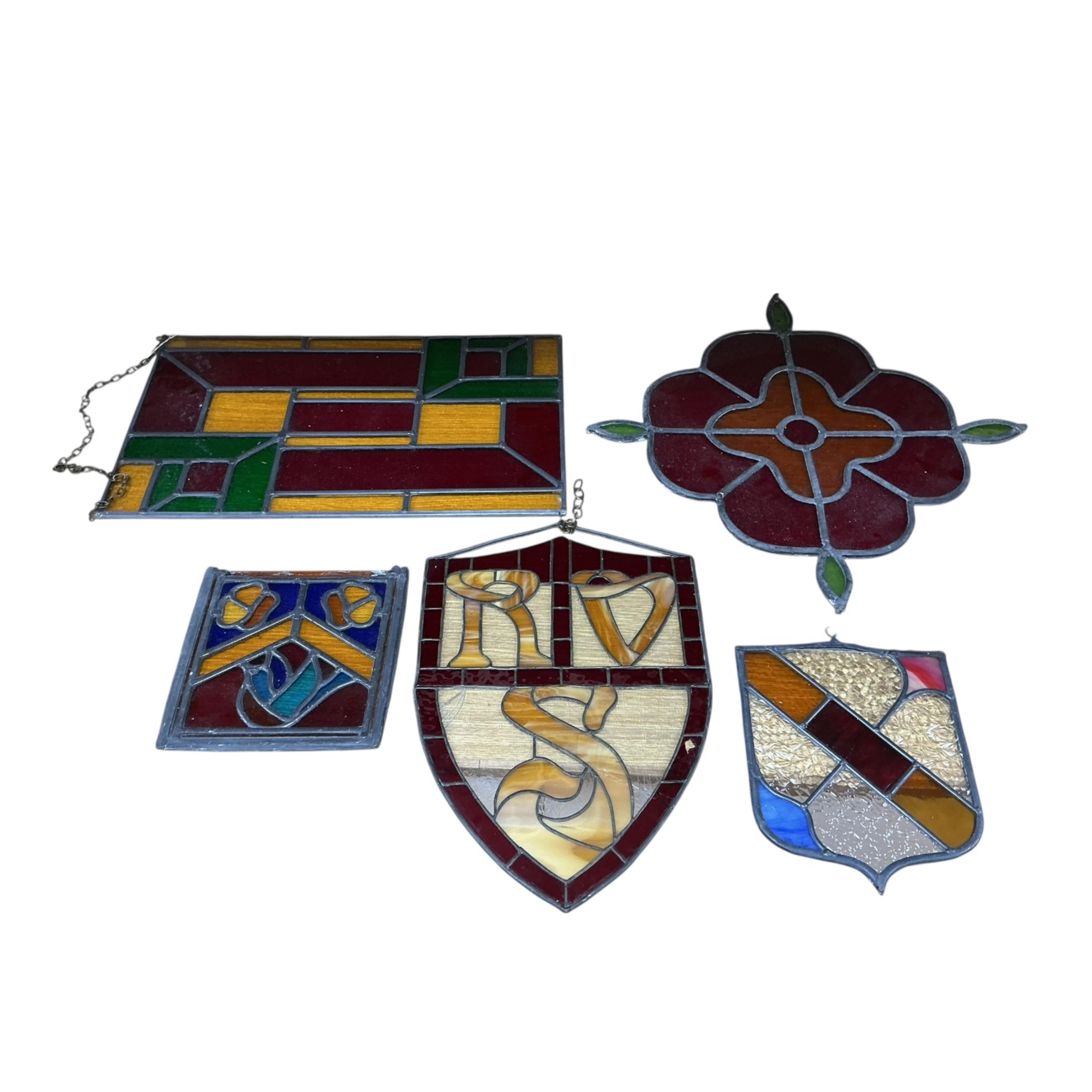 Lot 3571 , Five leaded stained glass panels, largest 52 x 52cm.