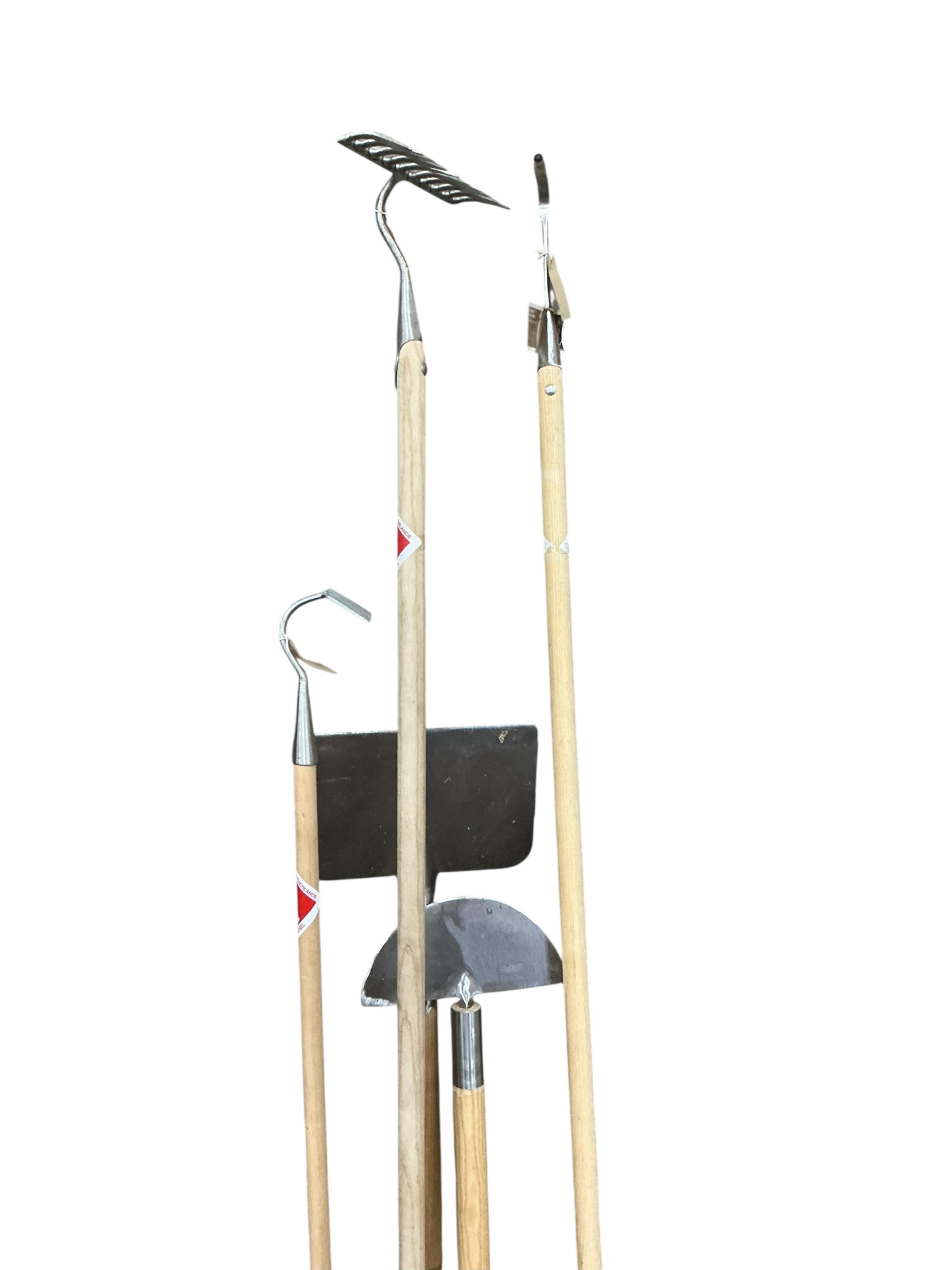 Lot 1066 , Five unused Sneeboer, The Netherlands, garden tools, including; a long handled stone scratcher, a narrow tine rake, an edging knife, an edging shovel and a lady’s hoe