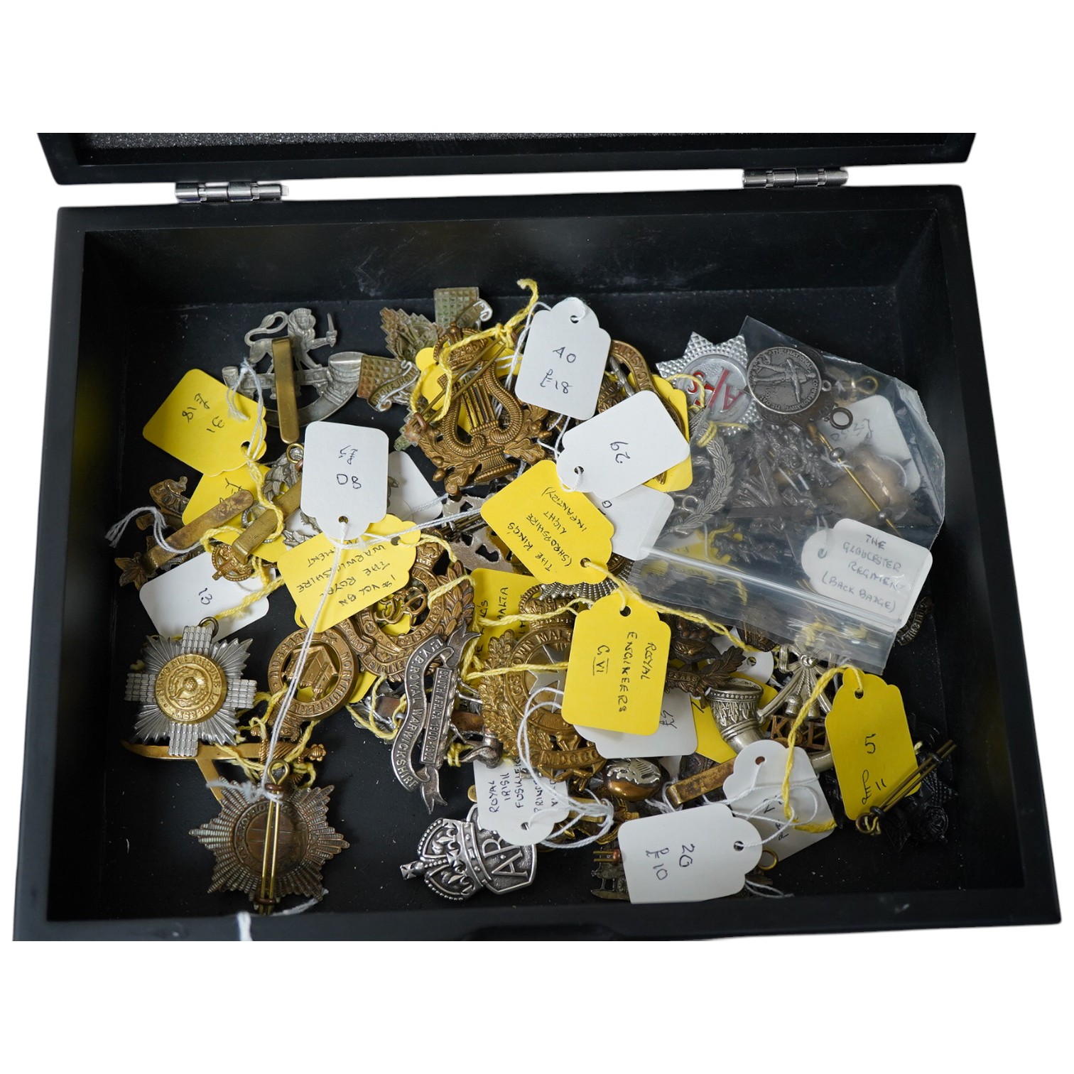 Forty military cap badges, parts and other related items, including; the King’s Own Malta regiment, the Air Defence Cadet Corps, the Cheshire regiment, the King’s Shropshire Light Infantry, the Royal Warwickshire regiment, the Monmouthshire regiment, the Coldstream Guards, ARP, the Royal Engineers, the East Surrey regiment, the St John’s Ambulance Service, the Glasgow Highlanders, etc.